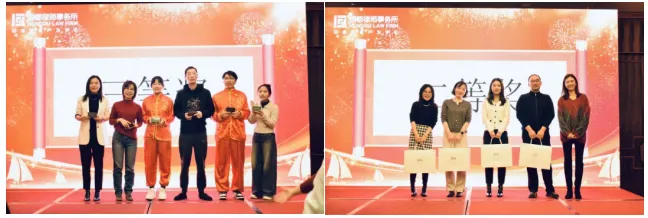 在歡聲笑語中,抽獎環(huán)節(jié)將晚會氣氛再次點燃。三等獎六名、二等獎四名的幸運兒們喜笑顏開,而金培榮律師更是抱得一等獎現(xiàn)金紅包而歸,將全場氣氛推向又一個高潮。